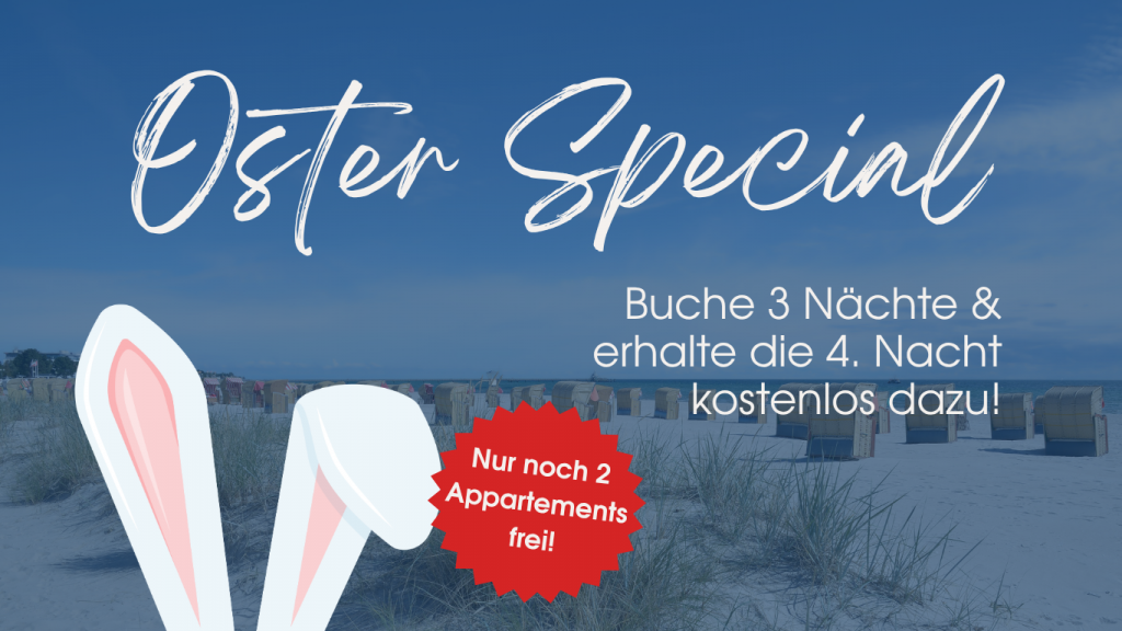 Verbringen Sie entspannte Osterferien an der Ostsee und genießen Sie ein besonderes Angebot: Bei einer Buchung von mindestens drei aufeinanderfolgenden Nächten erhalten Sie eine zusätzliche Nacht kostenlos. Das bedeutet, mehr Zeit zum Entspannen, Spazieren am Strand und für unvergessliche Momente mit der Familie oder zu zweit – ganz ohne Aufpreis.